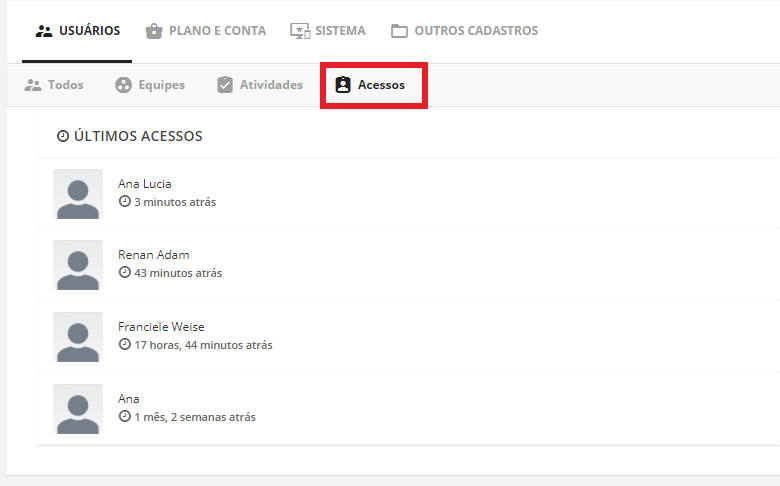 Para consultar os acessos ao sistema, continue nessa aba e clique em “Acessos”. Assim, você consegue visualizar a última vez que cada usuário fez login na conta através do site.