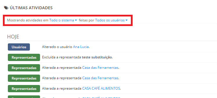 Nessa tela, é possível filtrar pelo tipo de atividade e pelo usuário responsável.