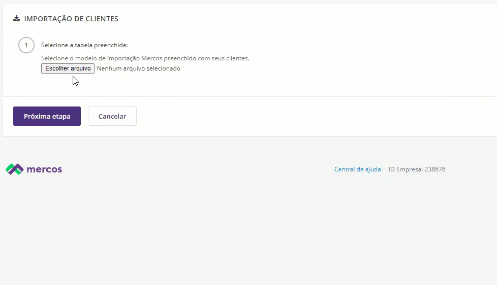 5. Em seguida, clique em “Escolher arquivo” para selecionar a planilha e depois em “Próxima etapa”;