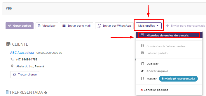 Ao enviar o pedido (ou orçamento) por e-mail, o Mercos oferece a opção para conferir se o envio foi realizado com sucesso ou se há algum problema na transmissão.