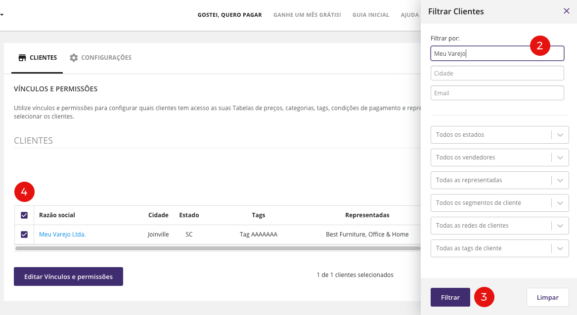 3. Preencha o painel “Filtrar Clientes” para identificar um ou mais clientes e clique em “Filtrar”;