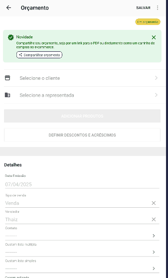 2. Inicie um orçamento e adicione os produtos;