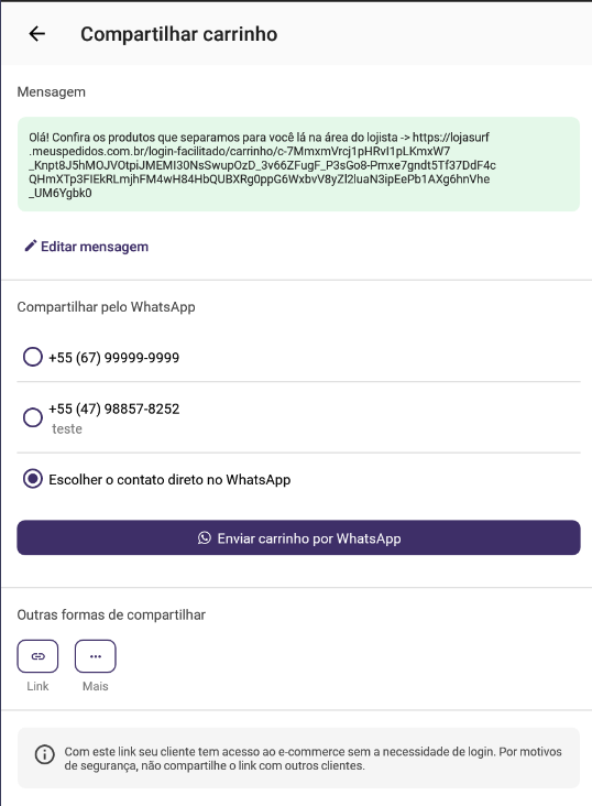 5. Antes de concluir o envio, o aplicativo exibe os contatos de telefone do cliente (quando existir), escolha o cliente e confirme o envio;