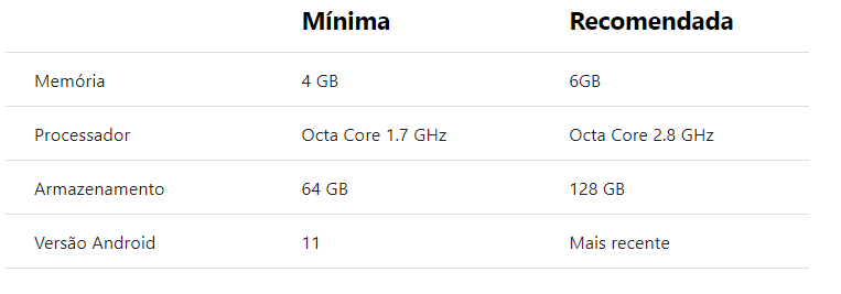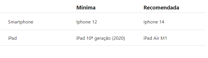 Recomendamos que, tanto para Android quanto iOS, o aparelho utilizado tenha sido lançado há menos de 3 anos.