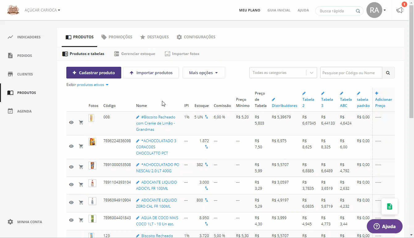 Representação: no menu lateral, clique em “Representadas”, clique na representada desejada e acesse a aba “Produtos”;