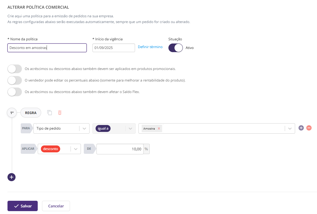 Assim, você pode configurar uma política comercial que seja válida apenas para pedidos de venda, garantindo que as regras sejam aplicadas de forma correta e automática.