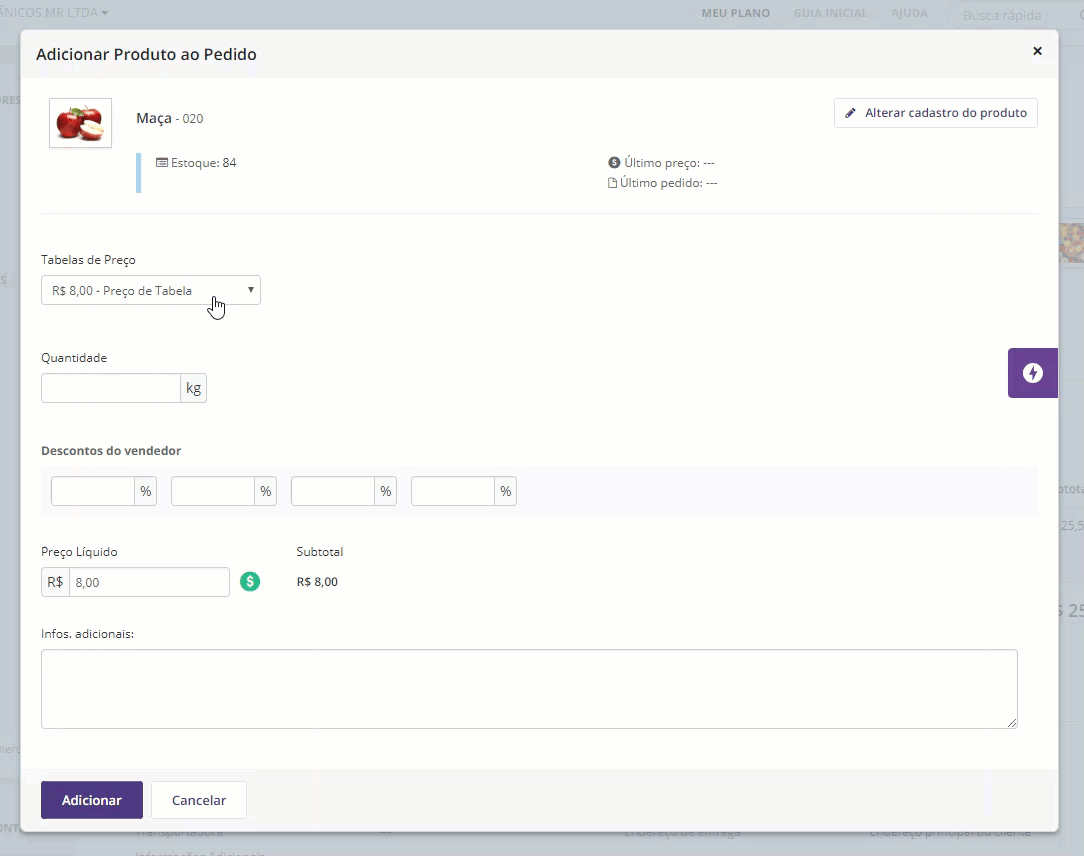 - Repita esses passos com os demais produtos que serão adicionados ao pedido.