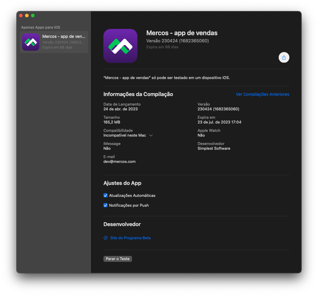 O TestFlight é o aplicativo oficial da Apple usado para gerenciar programas Beta. É por meio dele que o Mercos Beta será instalado, substituindo a versão atual do aplicativo no seu dispositivo.