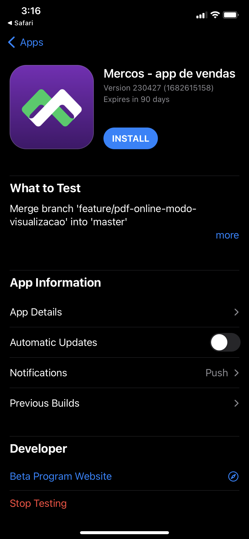 4. O TestFlight será aberto automaticamente com a opção de instalar a versão Beta do aplicativo Mercos;