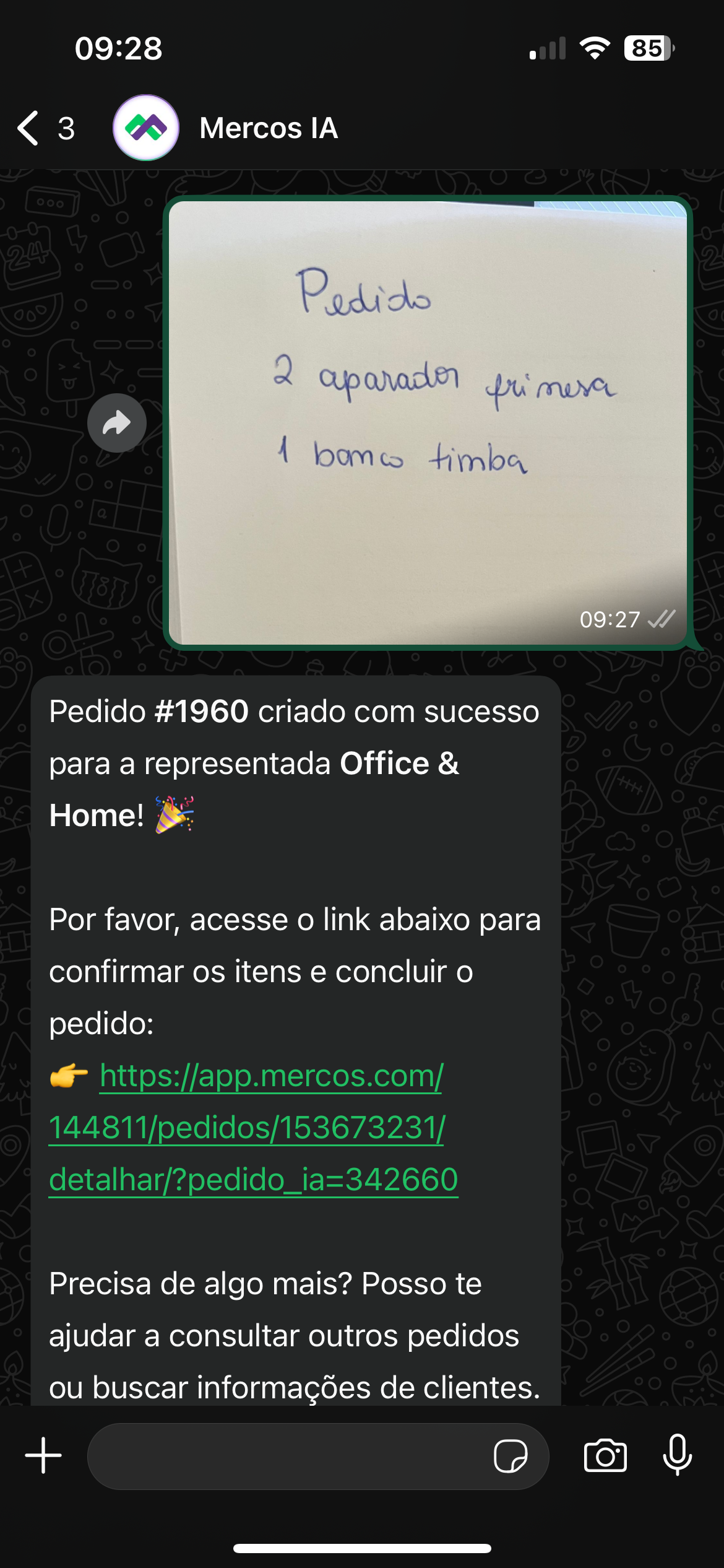 Recebeu um pedido por WhatsApp e quer transformá-lo em um orçamento no Mercos de forma rápida e prática? Basta encaminhar essa mensagem para o WhatstApp da Mercos IA que em segundos seu orçamento estará pronto para ser revisado.
