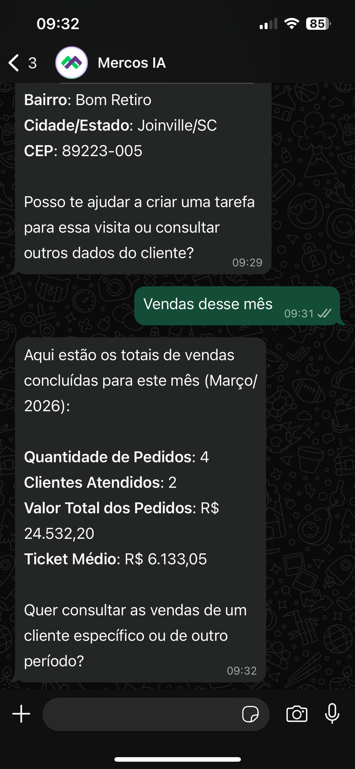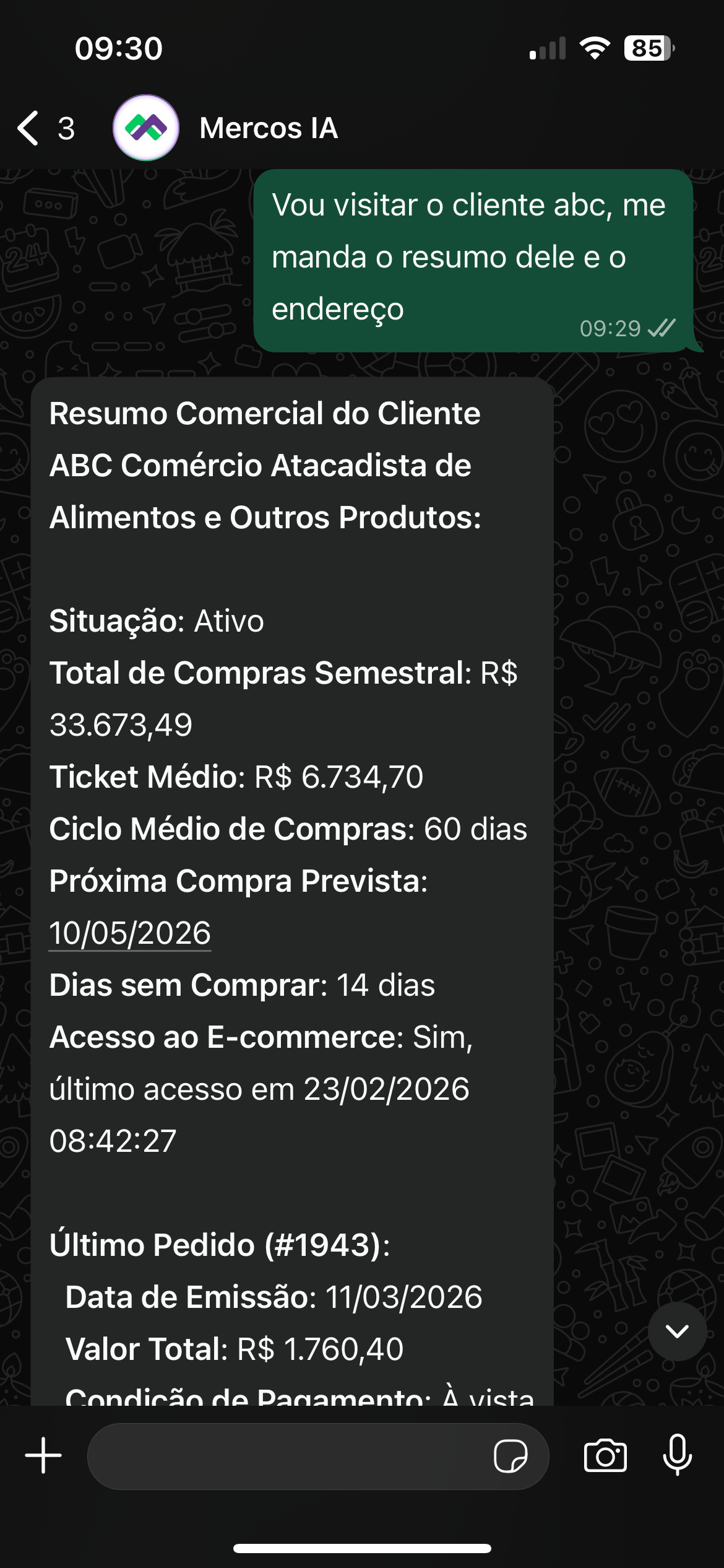 Tenha um resumo completo do seu cliente direto no WhatsApp e prepare-se melhor para cada visita.