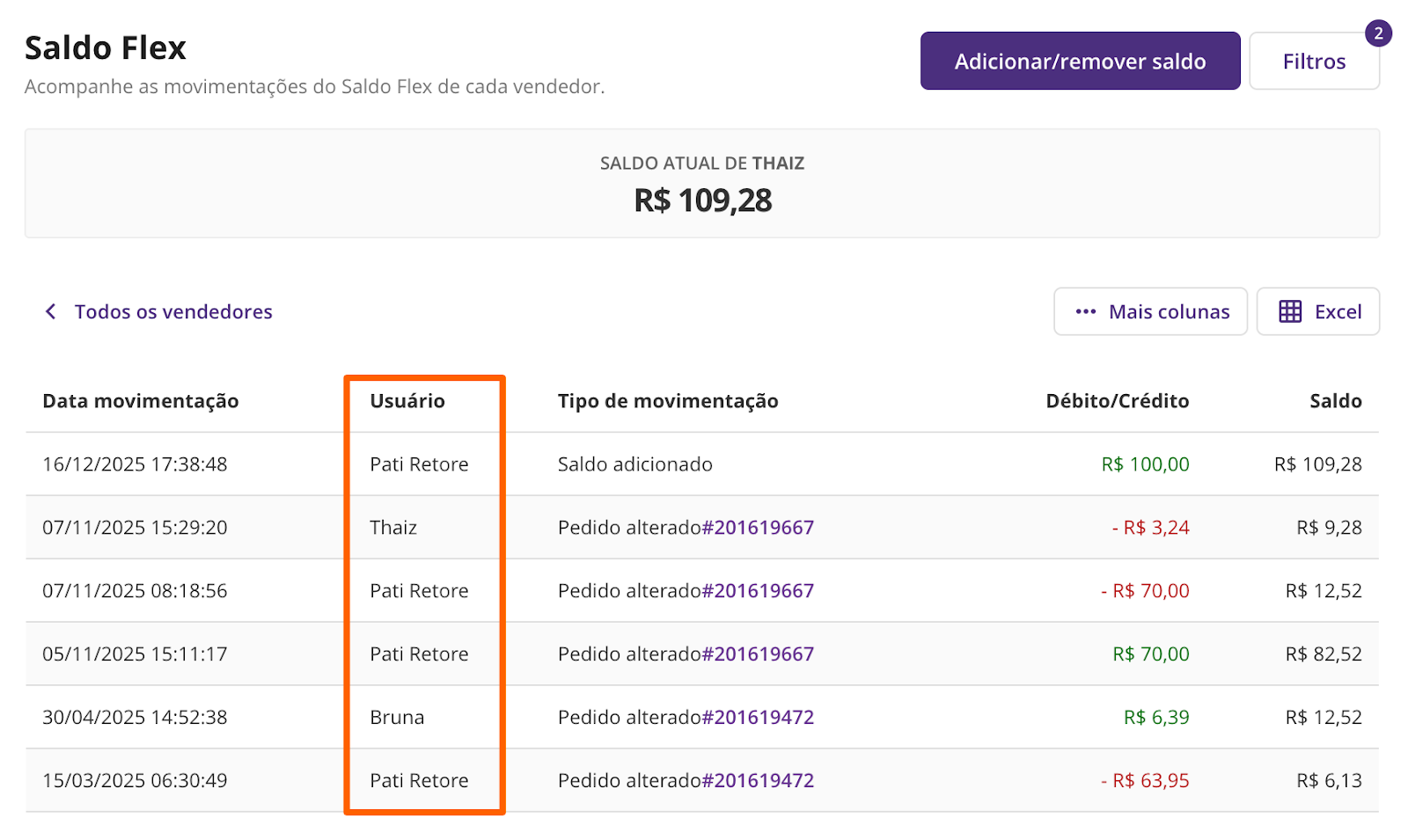 Adicionamos uma nova coluna no relatório de Saldo Flex que identifica o usuário responsável por cada movimentação. Essa nova informação facilita a análise dos gestores, especialmente quando há muitos ajustes realizados pelos administradores da conta.