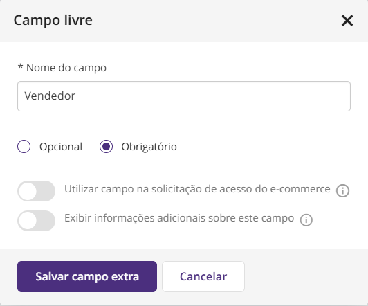 A configuração de obrigatoriedade está disponível para todos os tipos de campo extra de cliente.