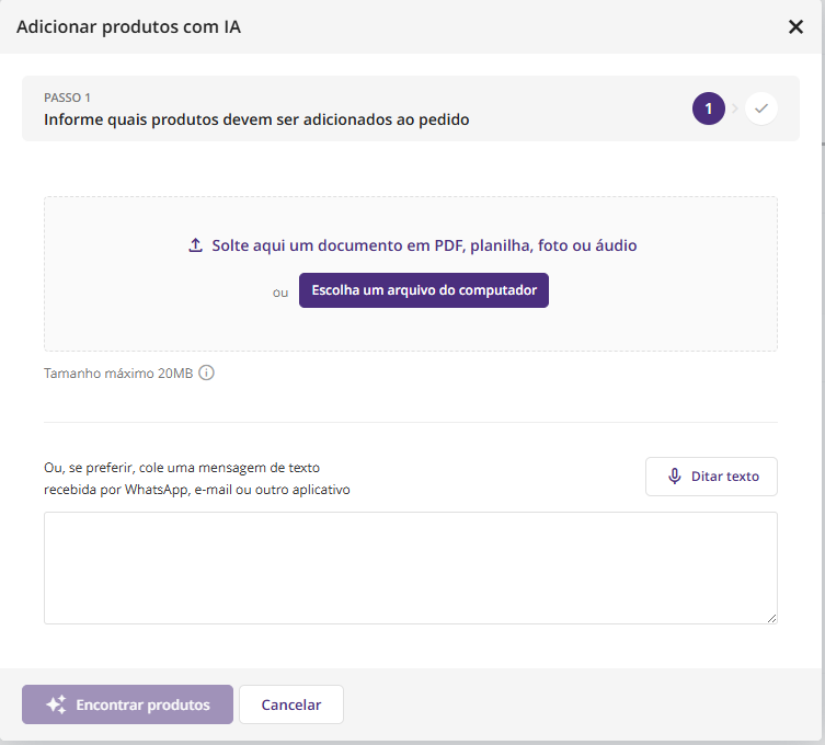 Você pode colar um texto ou enviar arquivos como fotos, PDFs, planilhas e áudios para que nossa IA interprete essas informações, identifique produtos e quantidades e gere o pedido para revisão.