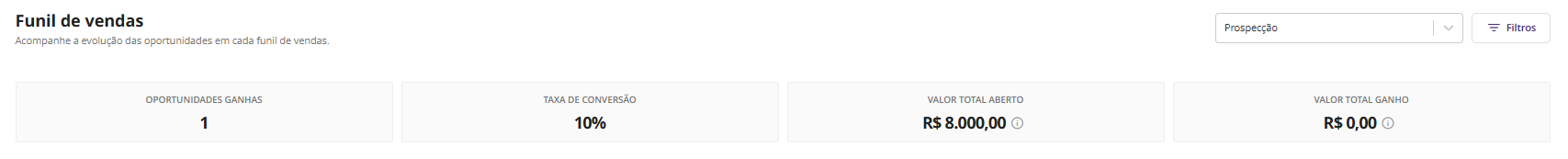 Valor total em aberto: Valor total em aberto corresponde a soma dos valores atribuídos a oportunidades que não foram finalizadas