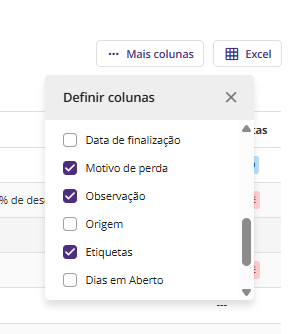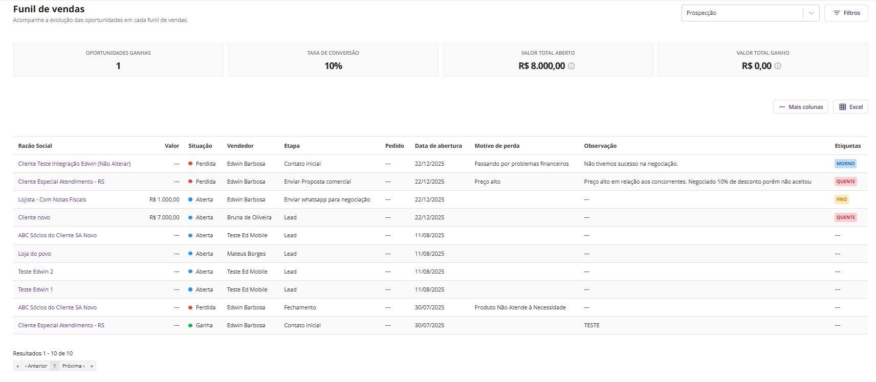 O relatório do funil de vendas pode ser exportado em formato Excel, basta clicar na opção "Excel".