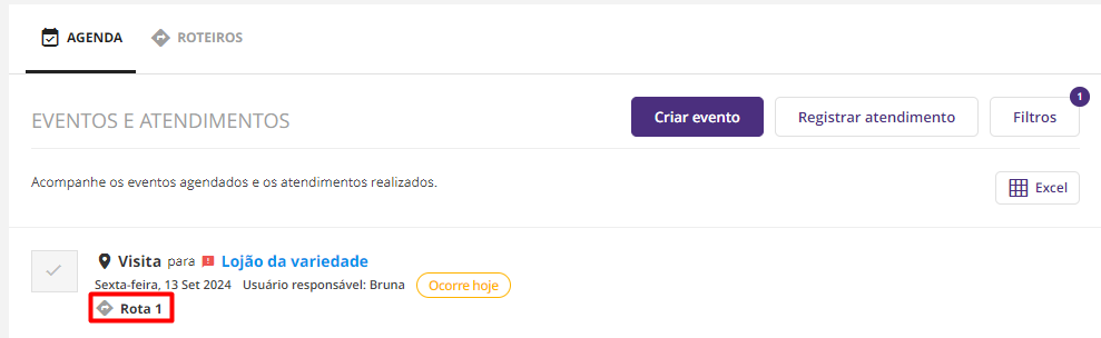Ele poderá identificar que se tratam de eventos de um roteiro pela marcação exibida logo abaixo da data do evento, como mostrado na imagem a seguir: