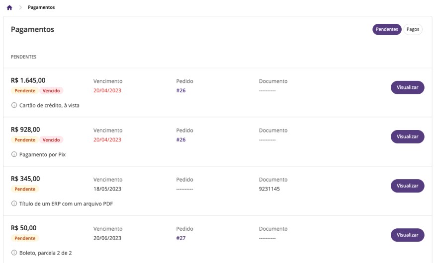 Feito isso, todas as informações de pagamento do varejista serão exibidas, desde títulos vencidos e pendentes, com o link para a segunda via, até o histórico de cobranças pagas. Isso facilita o acompanhamento dos pedidos e parcelas já quitados.