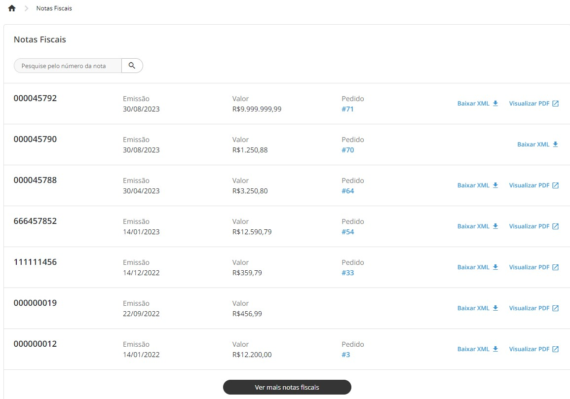 Para mais informações, acesse a documentação técnica da segunda via de notas fiscais.Você pode oferecer mais autonomia aos varejistas ao apresentar as notas fiscais diretamente no seu Portal. Para exibir a tela de notas fiscais, você deve: