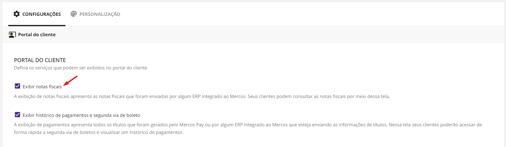 Para exibir as notas fiscais no Portal do Cliente, essas informações devem ser enviadas pelo ERP ao Mercos por meio da integração. Se tiver interesse em utilizar esse recurso, entre em contato com seu integrador para que ele envie as informações de notas fiscais ao Mercos.