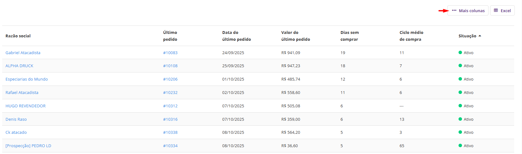 - Dados do último pedido: número, data e valor do último pedido realizado pelo cliente. Essa informação permite ter noção de qual é o potencial em vendas que se pode alcançar com esse cliente.