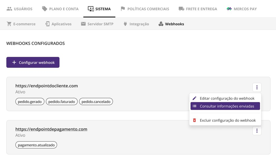 • É permitido configurar até 5 webhooks;