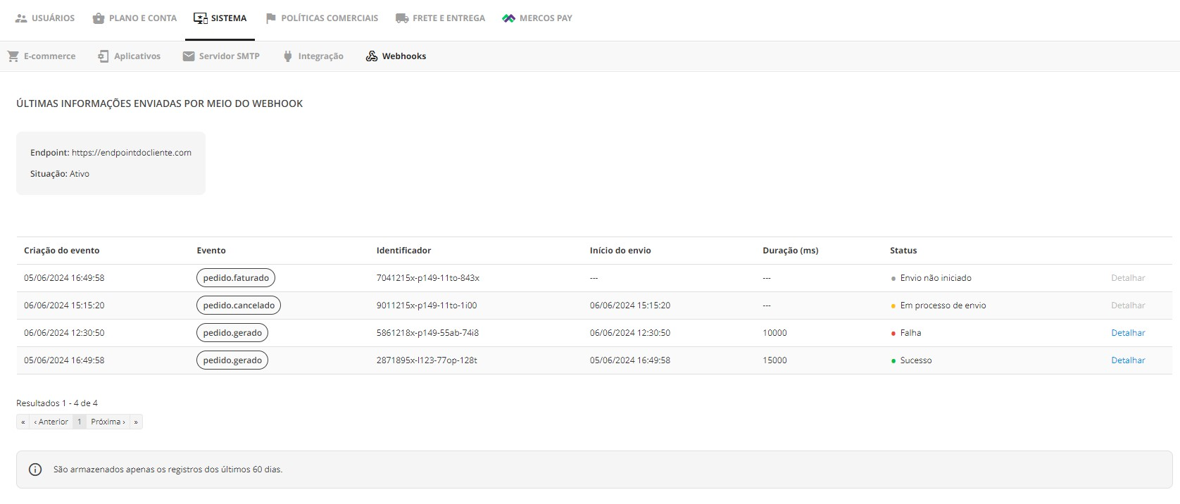 Importante: apenas as notificações dos últimos 60 dias são armazenadas.São realizadas três tentativas de envio para cada notificação, e os dados da requisição e da resposta referentes a cada tentativa podem ser visualizados nos detalhes da notificação. A segunda tentativa ocorre apenas se a primeira não for concluída com sucesso. Da mesma forma, a terceira tentativa acontece somente quando as duas primeiras não obtêm sucesso.