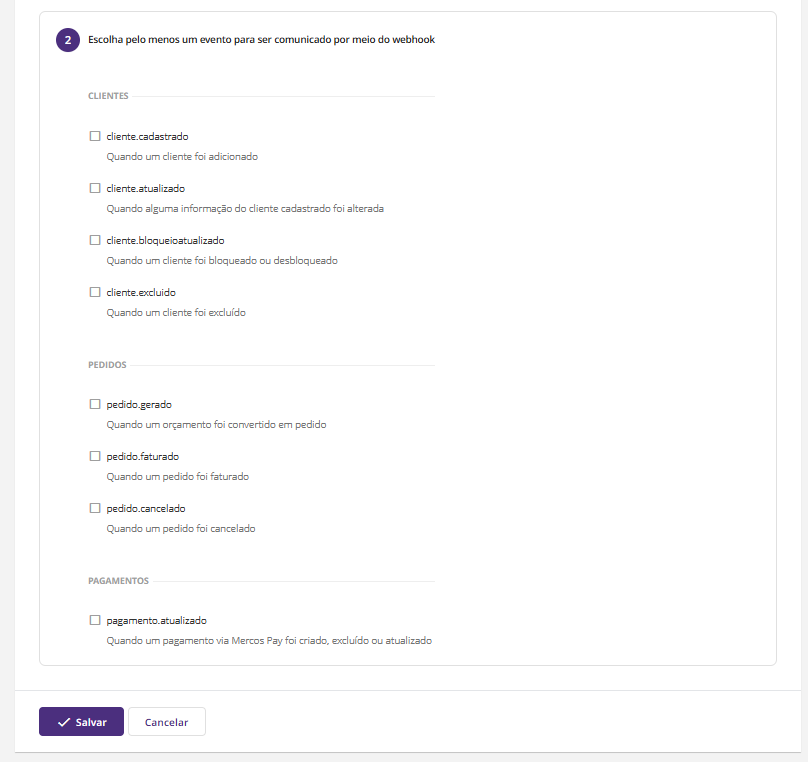 • Pelo menos um tipo de evento precisa ser selecionado ao configurar um webhook;